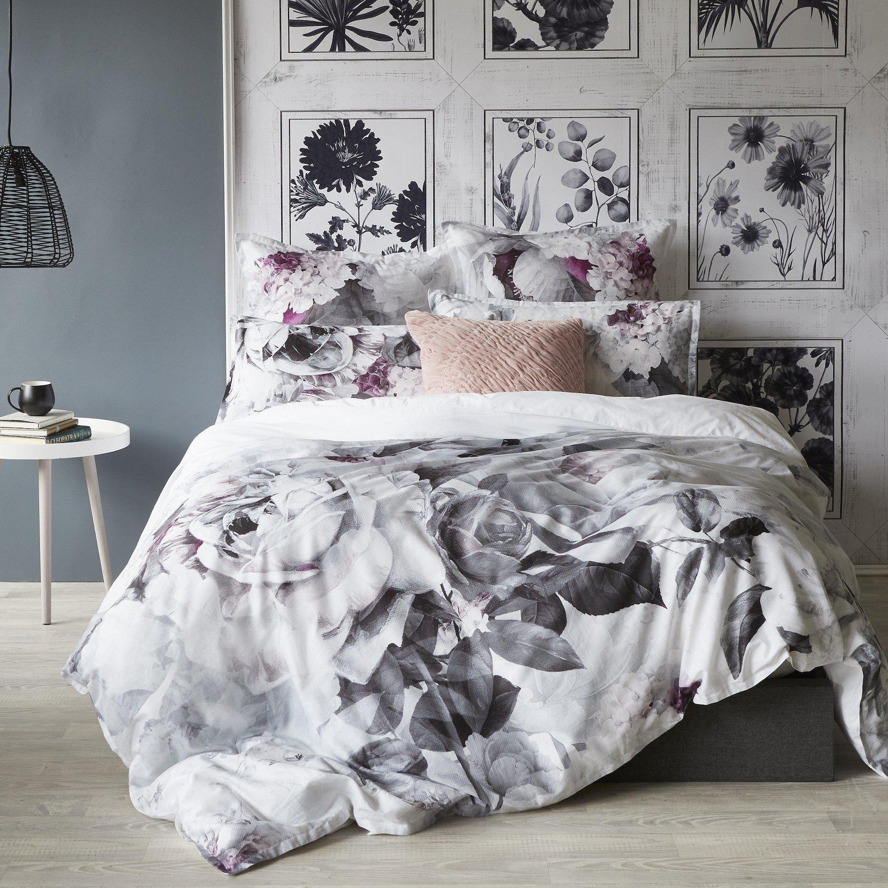 The Lucia Grey Quilt Cover Set features an oversized floral pattern in grey tones with subtle highlights of fuchsia and is printed on a pure cotton fabric.