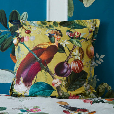The Euro pillowcase has a similar pattern to what can be seen in the matching quilt set but has a contrasting gold background while the reverse side has the same reverse pattern as the rest of the quilt set, a silver toned silhouette on a pure white background. Euro pillowcases are sold separately, each pack contains one 65x65cm pillowcase, so order two when you have a pair of euro pillows to cover. Like the standard pillowcases included in the matching quilt cover set, the euro pillowcase is also finished with an envelope closure. Quilt cover sets and coordinating cushions sold separately.