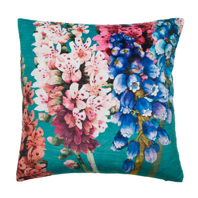 This exquisite cushion, adorned with lavish bold and romantic florals that add a touch of elegance and charm to any space. The vivid colours against the contrasting teal background colour make for a sophisticated look.
